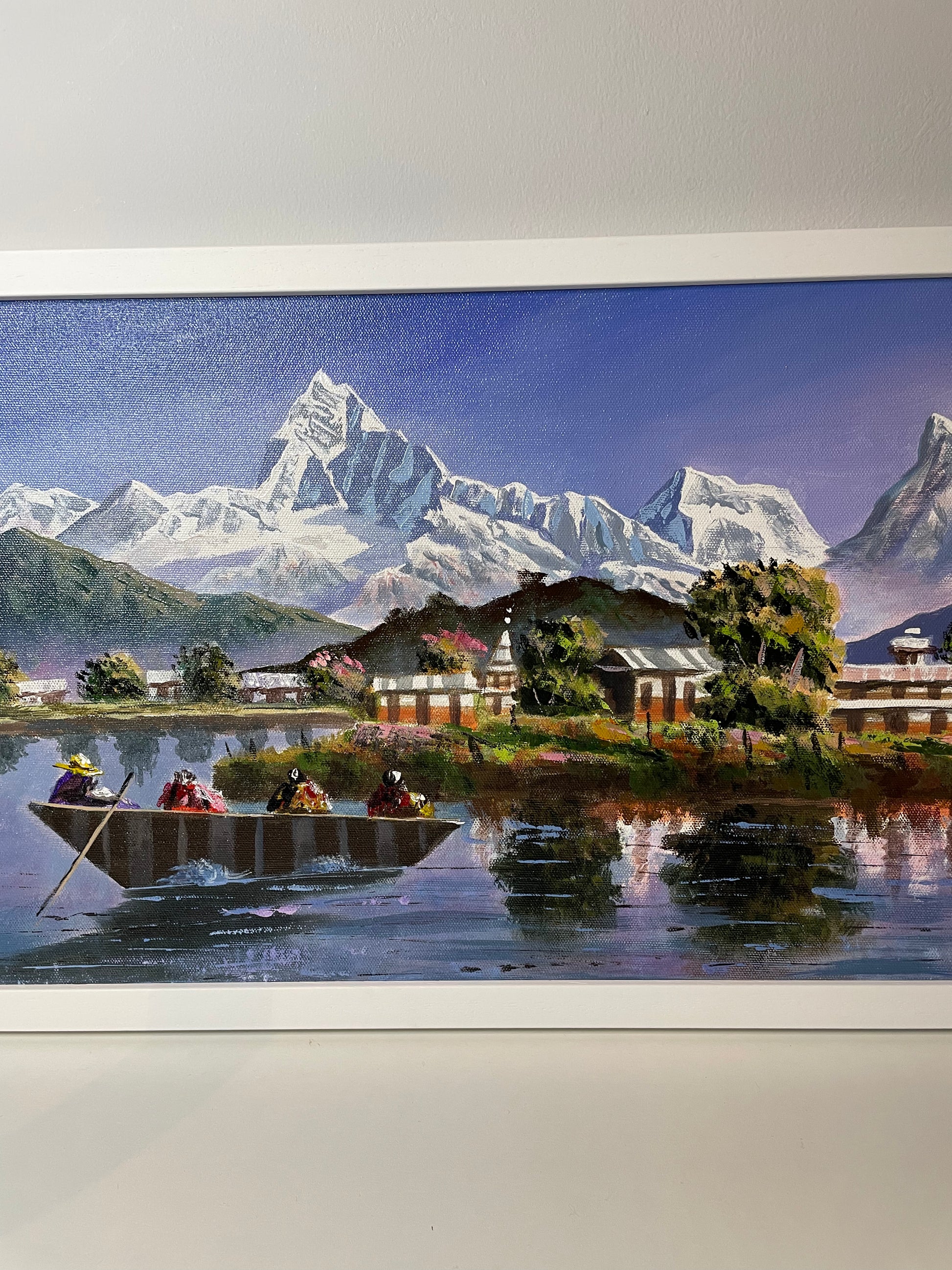 This acrylic painting by Nur Rana showcases Machhapuchhre rising majestically above serene Himalayan lakes. The artwork beautifully captures the reflective waters alongside the dramatic fishtail silhouette of the mountain, complete with people in boats. Standing at 6,993 meters, this sacred peak has yet to be climbed and is admired for its breathtaking shape. In the background, the Annapurna mountain range, towering at 8,091 meters, is recognized worldwide for its stunning beauty.