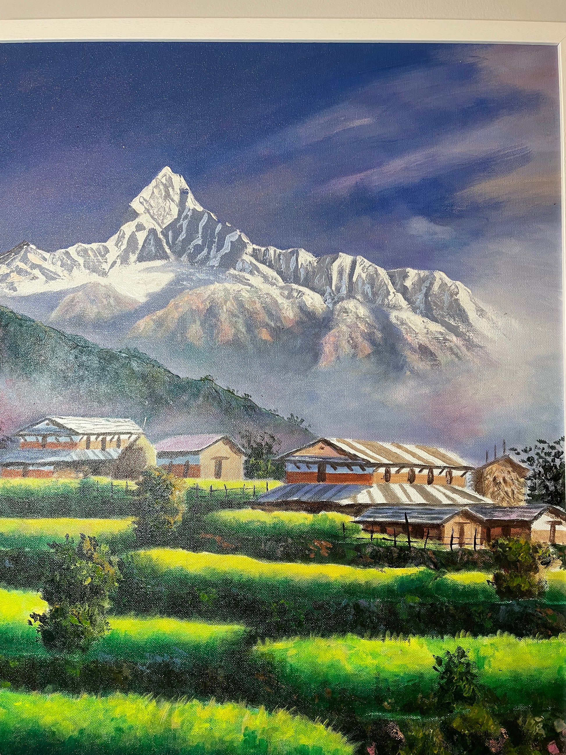 Machhapuchhre Mountain & Annapurna Village Life – Acrylic Painting of the Himalayas